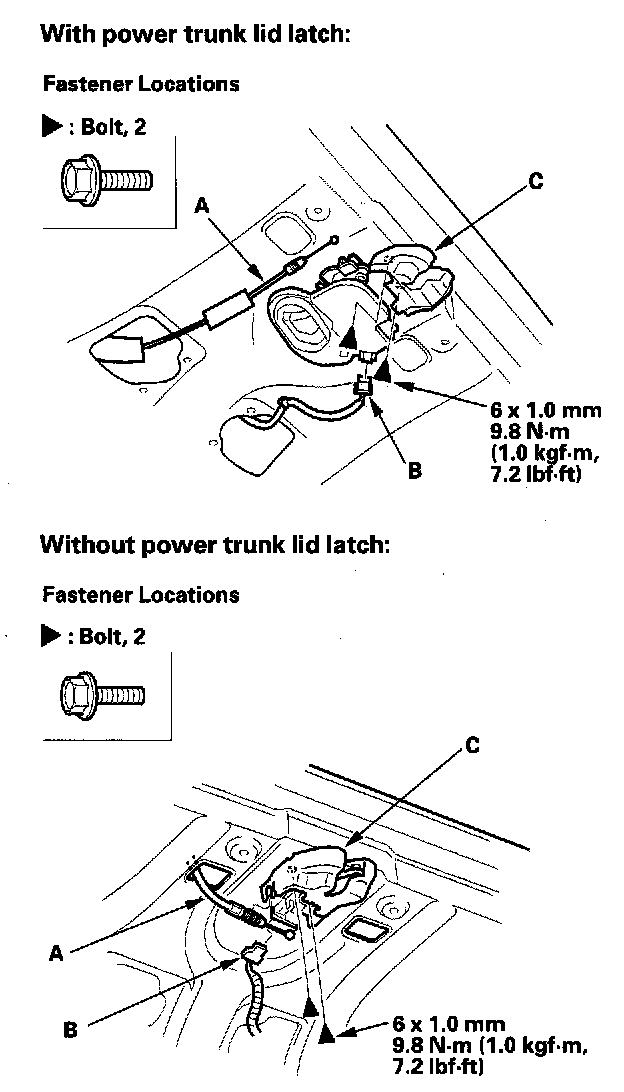 3. Remove the bolts from the trunk lid latch (C).