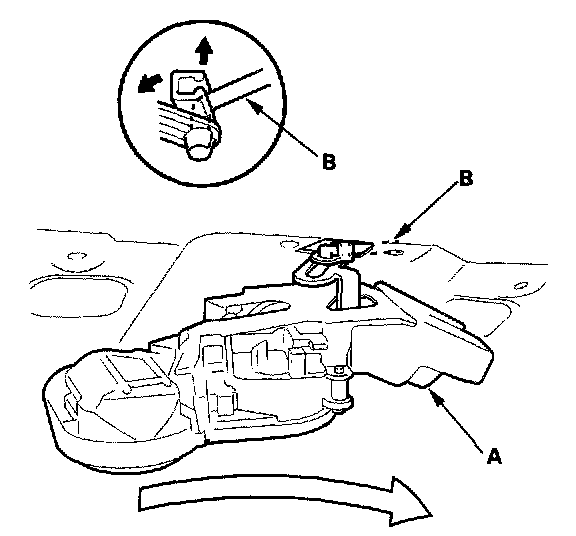 4. Pull the trunk lid latch (A) out, and on 4-door, disconnect the cylinder rod (B) from the trunk lid latch. Take care not to bend the cylinder rod.
