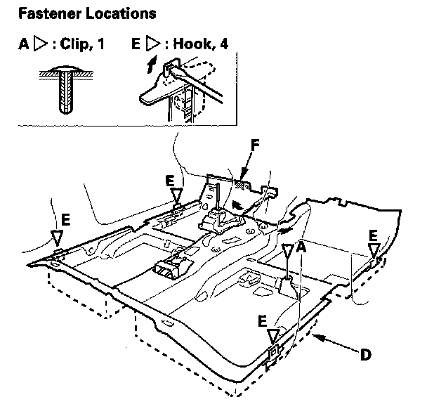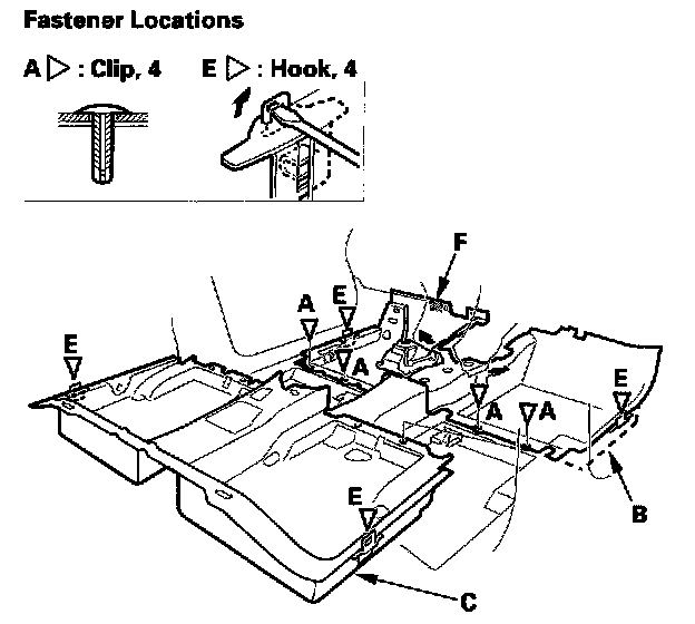 8. Release the hooks (E) with a flat-tip screwdriver, and the fastener (F), then remove the carpet (one-piece type) or the front and rear carpets (two-piece type).