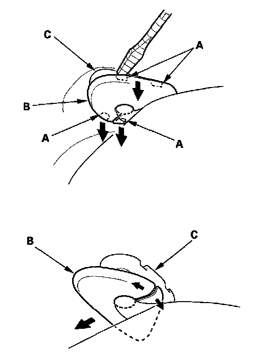 2. From both sides, using a flat-tip screwdriver, release the tabs (A), then remove the sunvisor cap (B) from the bracket (C). Turn the cap, and remove it.