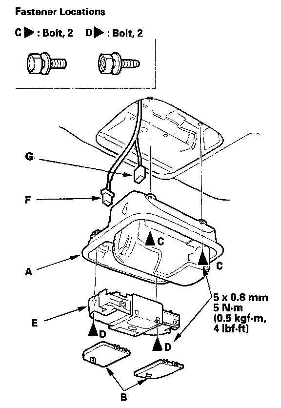 -3 Pull out the roof console, and front individual map light (E). Disconnect the front individual map light connector (F), and if equipped, ambient light connector (G).