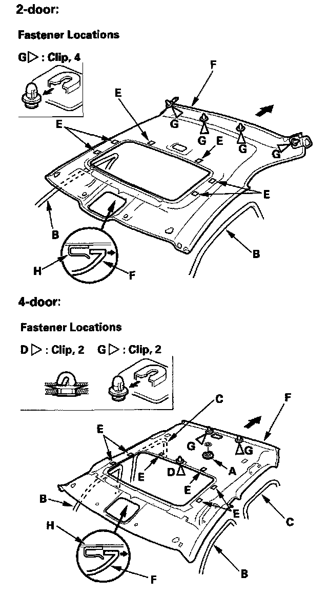 -4 With the help of an assistant, release the headliner from the clips (G) and moonroof frame (H) by sliding the headliner rearward, and lowering the headliner.