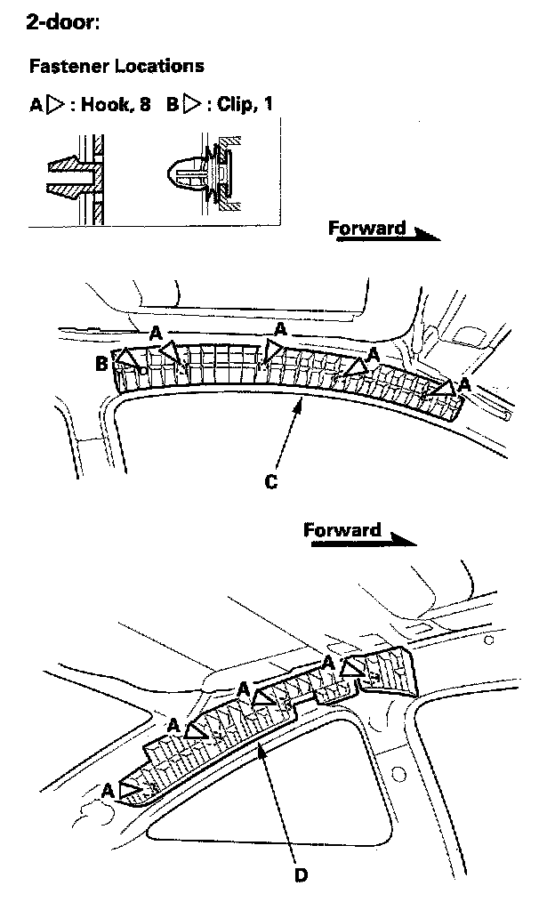 -2 With the help of an assistant, release the headliner (C) from the clips (D) by sliding the headliner rearward, and lowering the headliner.