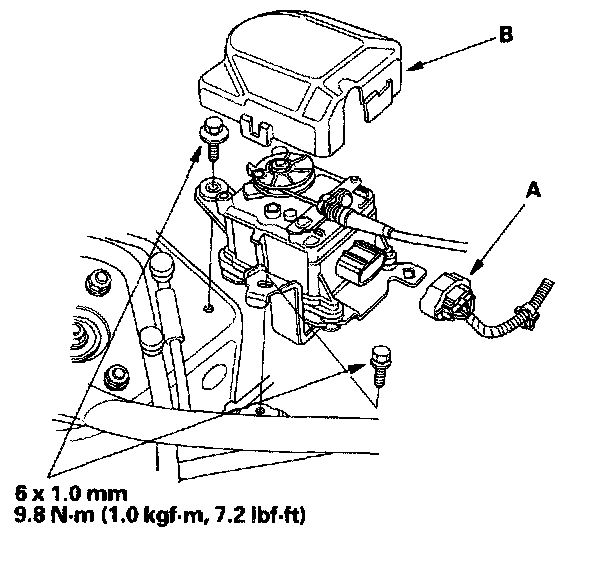 Cruise Control Actuator/Cable Replacement1. Loosen the locknut (A), then remove the cruise control cable (B) from the throttle linkage.