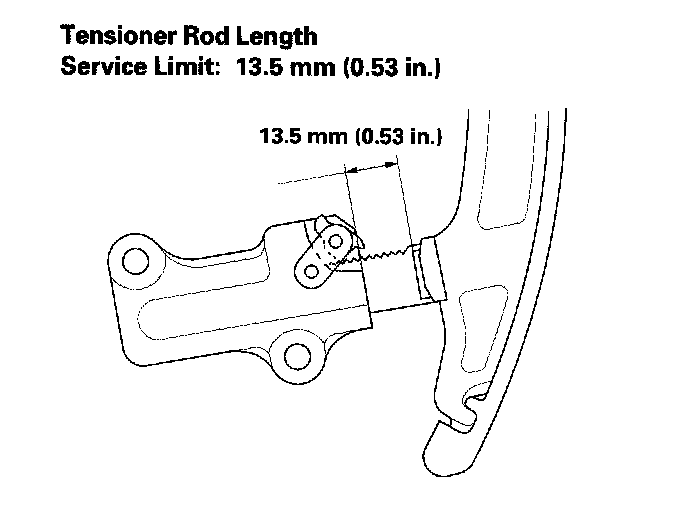 12. Measure the tensioner rod length between the tensioner body and bottom of the flat surface section on the tensioner rod. If the length is over the tolerance, replace the cam chain and oil pump chain.