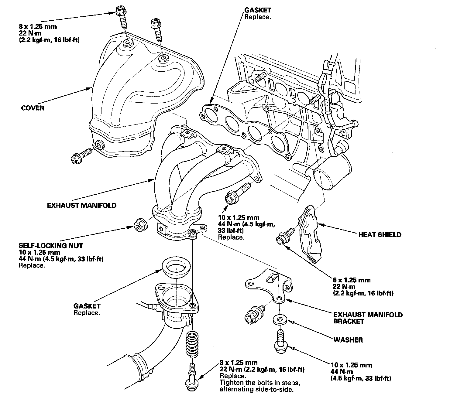 4. Install the exhaust manifold and tighten the bolts/nuts in a crisscross pattern in two or three steps, beginning with the inner nut.