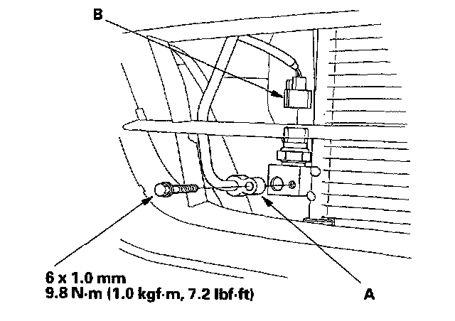 5. Remove the bolt, then disconnect the receiver line (A) from the condenser. Disconnect the A/C pressure switch connector (B).