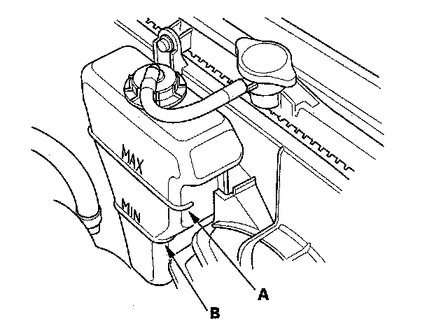 1. Look at the coolant level in the reserve tank. Make sure it is between the MAX mark (A) and MIN mark
