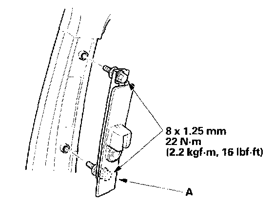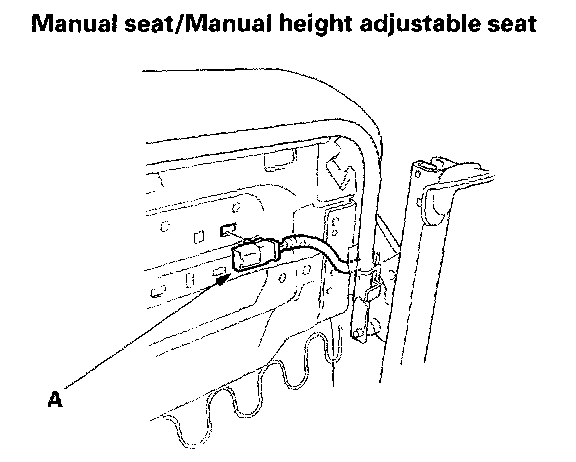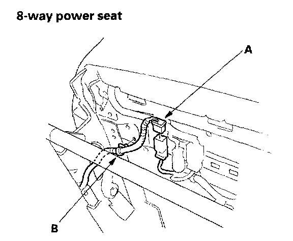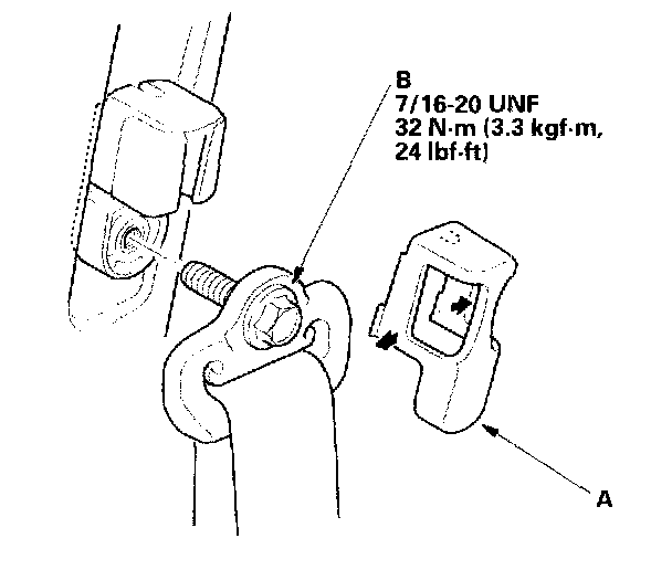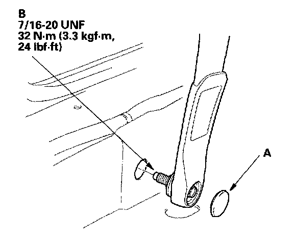 - '03 model driver's and passenger's seat belts and '04 model driver's seat belt: Remove the lower anchor cap (A), and remove the lower anchor bolt (B).
