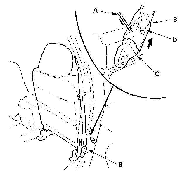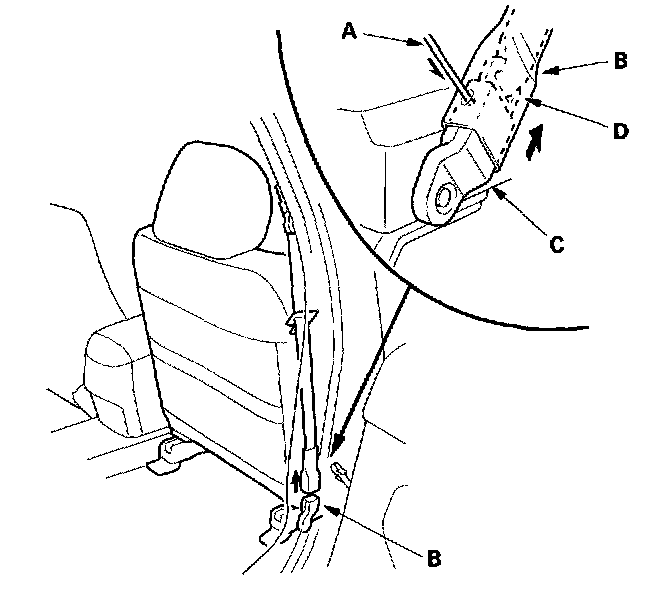 - '04 model passenger's seat belt: Carefully insert the tip of a small screwdriver (A) through the hole in the back of the front seat belt lower anchor cover (B) and into the hole in the front seat belt lower anchor (C).