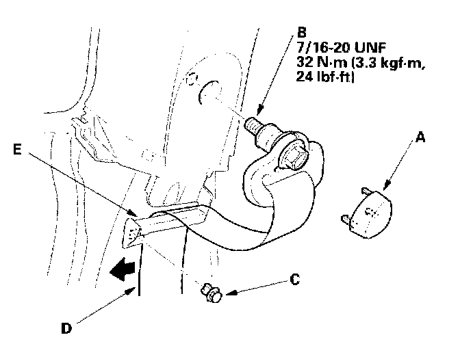 8. Disconnect the seat belt tensioner connector (A). Remove the upper retractor mounting bolt (B), and the lower retractor bolt (C), then remove the front seat belt (D) and retractor (E).