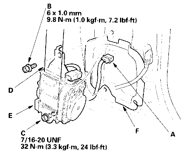 7. Disconnect the seat belt tensioner connector (A). Remove the retractor mounting bolt (B), and the retractor bolt (C), then remove the front seat belt (D) and retractor (E).