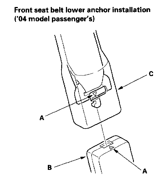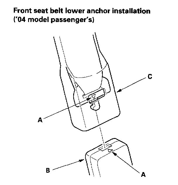 - '04 model passenger's seat belt: Before attaching the front seat belt lower anchor, make sure there are no twists or kinks in the belts. Triangle marks (A) on the anchor plate (B) and on the lower anchor (C) must face the same side.