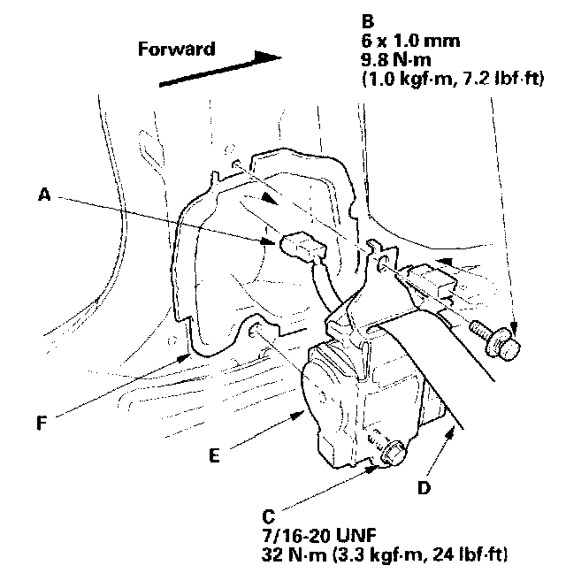 Unlock the lower anchor by pushing in on the screwdriver. Remove the screwdriver, and then detach the front seat belt anchor plate (D) and anchor cover from the lower anchor.