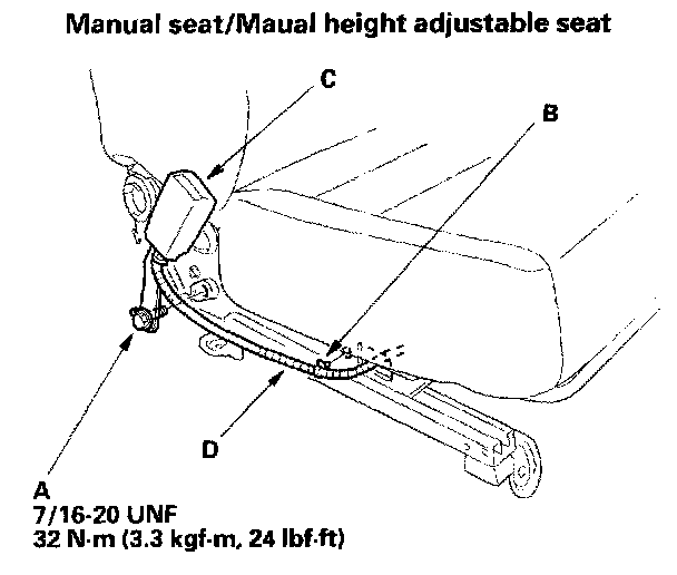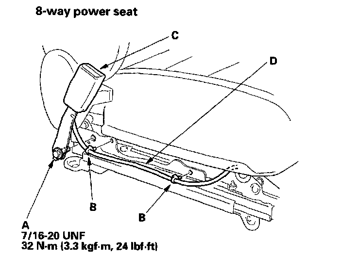 7. Pull the seat belt switch harness (D) out through the space between the seat cushion and the seat linkage (except manual seat), or through the hole in the seat track (manual seat).