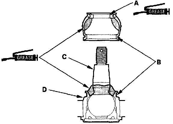 3. Wipe the grease off the tapered portion of the pin (C), and pack fresh grease into the base (D). Do not let dirt, or other foreign materials get into the boot.