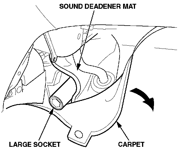 5. Pull back the carpet and sound deadener mat from the side of the floor tunnel. Insert a large, deep socket (24 mm or larger) under the sound deadener mat, past the second body seam. Repeat this step for the other side of the floor tunnel.