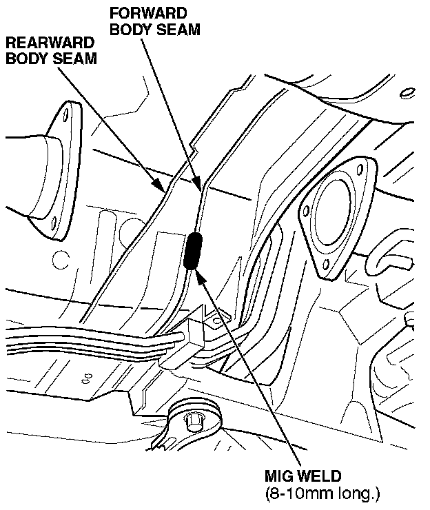 13. Make an 8-to-10-mm-long MIG weld halfway up the wall of the floor tunnel on the forward body seam. Do this on both walls of the floor tunnel.