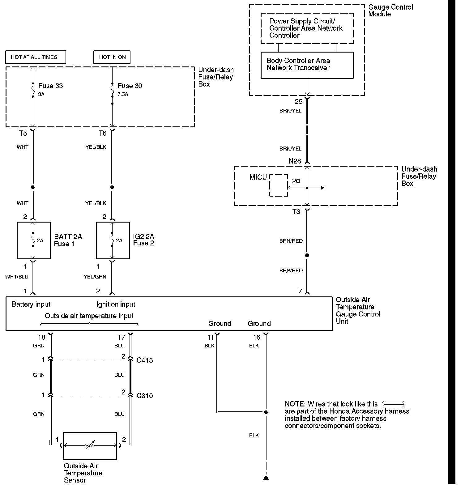 NO - Repair the open in the YEL/BLK wire between the No. 30 (7.5A) fuse in the fuse/relay box and the 1G2 (2A) accessory fuse, or repair the open in the YEL/GRN wire between the BATT (2A) fuse and the outside air temperature gauge control unit.[]