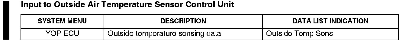 *The outside air temperature sensor changes resistance with changes in ambient air temperature. The outside air temperature control unit converts the resistance value of the outside air temperature sensor into a digital signal and sends it over the B-CAN line. The gauge control module receives the signal, and displays it as the outside air temperature.