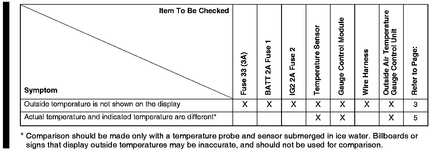 If the engine coolant temperature is 140°F (60°C) or higher when the ignition switch is turned on, the last outside temperature indicated will be displayed. If the engine coolant temperature is 139°F (59°C) or below when the ignition switch is turned on, the current outside temperature will be displayed. This logic has been written into the gauge control module to help prevent abnormal or fluctuating outside temperature indicator readings due to heat reflection from the road, the engine, and surrounding traffic.*