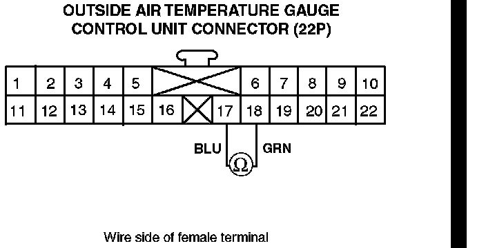 5. Check for resistance between terminal No. 17 (BLU) and terminal No. 18 (GRN) of the outside air temperature gauge control unit connector (22P).