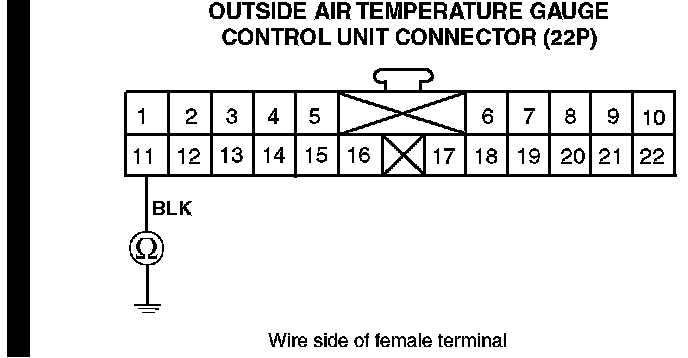 7. Check for continuity between terminal No. 11 (BLK) of the outside air temperature gauge control unit connector (22P) and body ground.