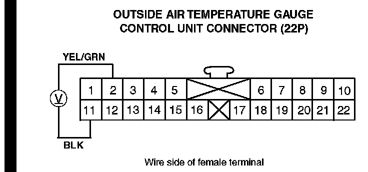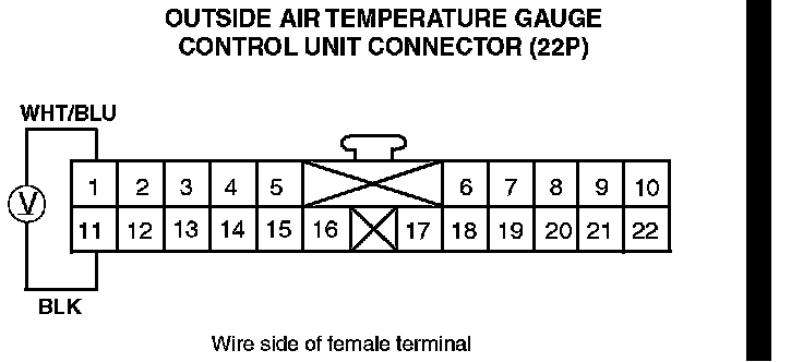 10. Measure the voltage between terminal No. 1 (WHT/ BLU) and terminal No. 11 (BLK) of the outside air temperature gauge control unit connector (22P).