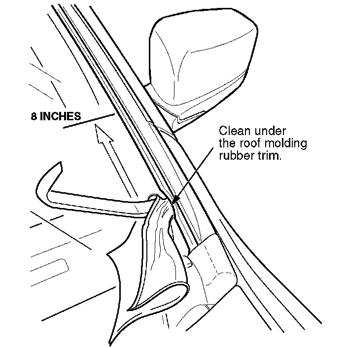 3. Clean the area between the roof molding rubber trim and the windshield: