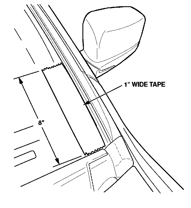 5. Apply an 8-inch (200 mm) piece of 1-inch-wide masking tape to the lower corner of the windshield, along the roof molding rubber trim.