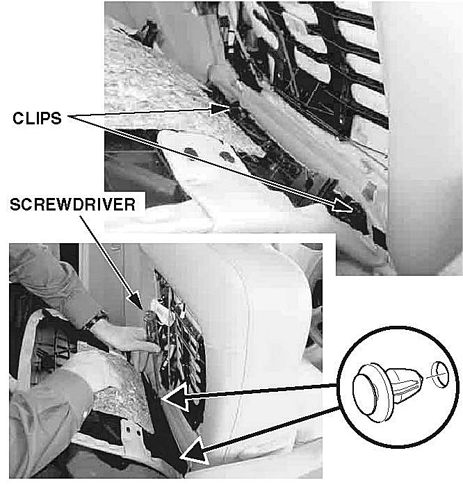 ^ Using a mallet, firmly hit the screwdriver until the clip breaks. Do not damage the panel alignment pins that extend through the seat frame.
