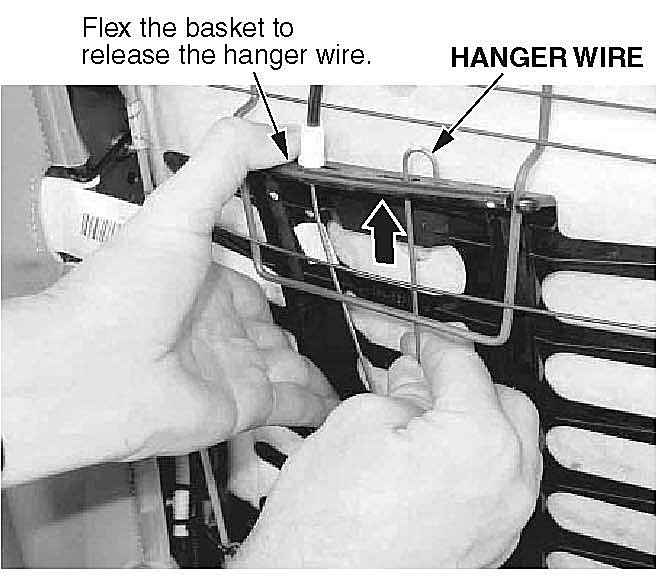 5. Pull down and flex the top of the basket assembly, then release the hanger wire from the top of the basket and the yoke bar.