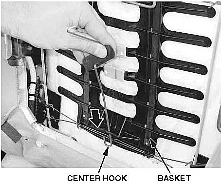 7. Lower the center hook until its short end clears the flange, then remove the center hook from the basket.
