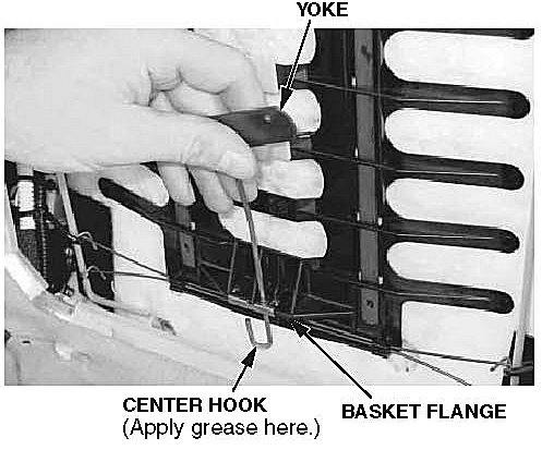 16. Apply Super High Temp Urea Grease to the short end of the center hook where it contacts the metal support on the basket flange, then install the hook with its small end on the left side of the flange. If the yoke is not connected to the center hook, reconnect it.
