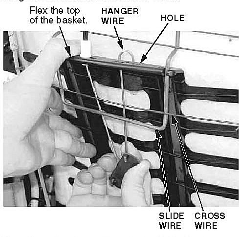 20. Route the top of the hanger wire behind the slide wire and the cross wire. Pull down and flex the top of the basket. Install the top of the hanger wire through the slot in the top of the basket, then move the wire to the right until the small end of the hanger hook is seated into the hole.
