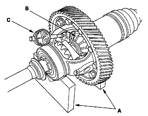 Backlash Inspection1. Place the differential assembly on V-blocks (A), and install both axles.