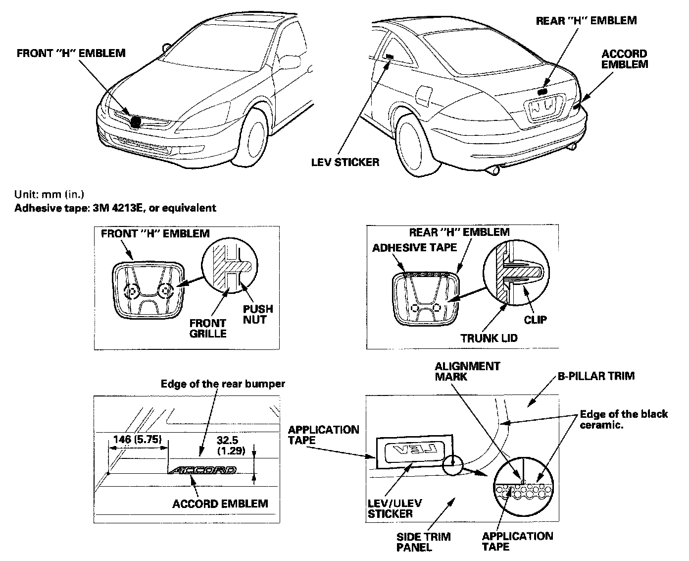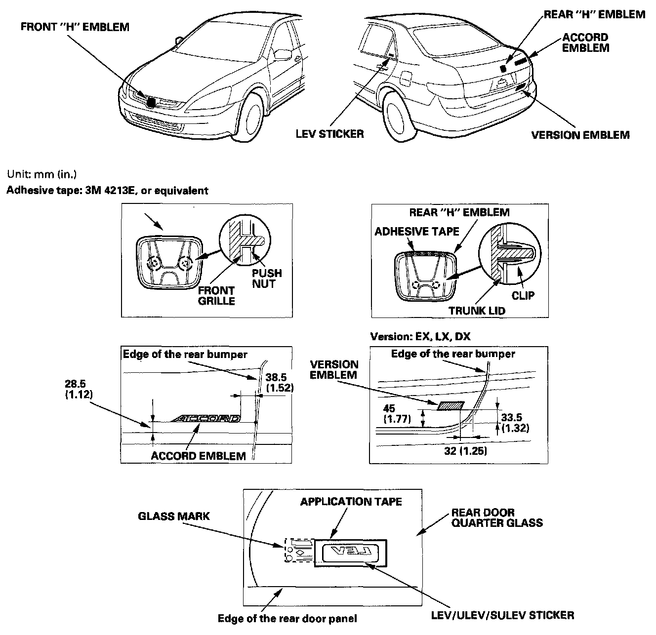 2. Apply the emblem/sticker where shown. When installing the LEV/ULEV/SULEV sticker on the inside surface of the rear door quarter glass, align rear edge of the application tape and bottom of the sticker with the glass mark, then press the sticker into place, and remove the application tape.