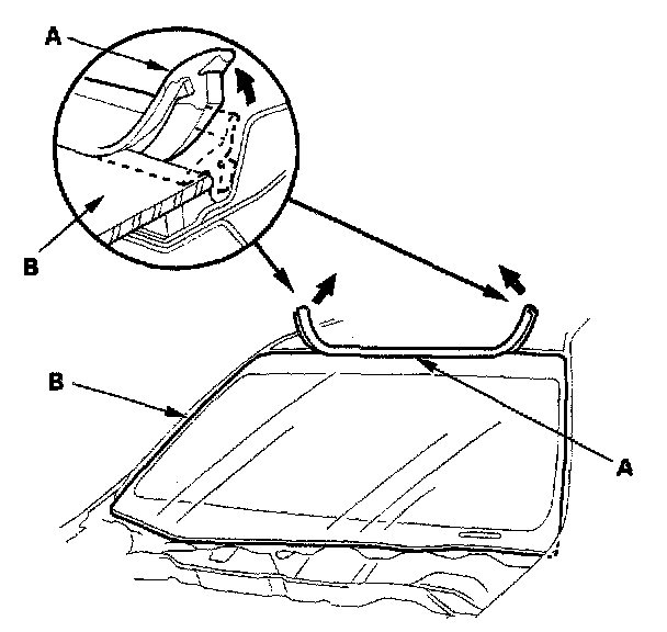 2. Remove the molding (A) from the upper edge of the windshield (B). If necessary, cut the molding with a utility knife.