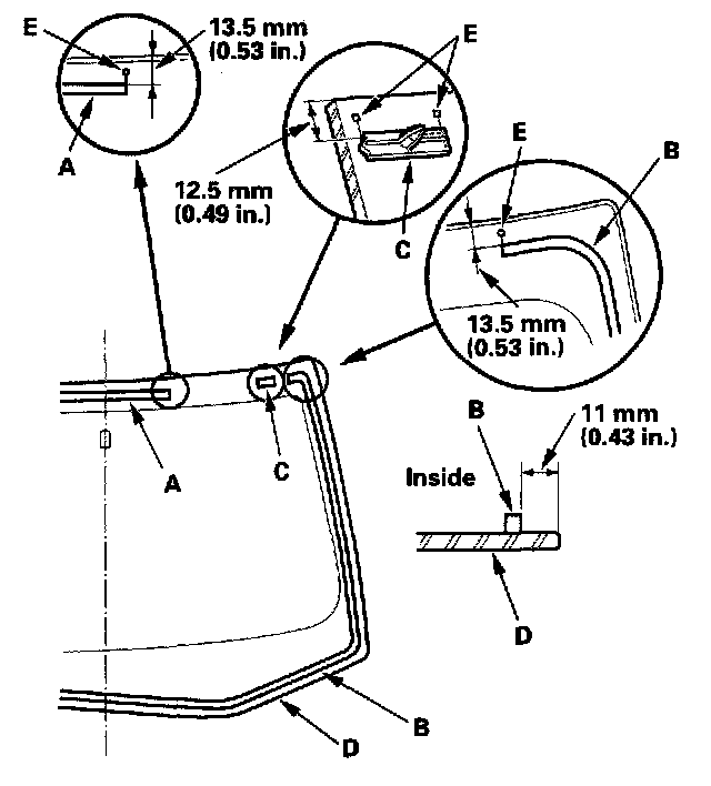 11. Glue the upper rubber dam (A), lower rubber dam (B), and clips (C) with adhesive tape (3M 4215, or equivalent) to the inside face of the windshield (D) as shown: