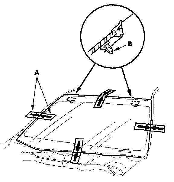 14. Set the windshield in the opening, and center it. Make alignment marks (A) across the windshield and body with a grease pencil at the four points shown. Make sure both clips (B) contact with the edge of the body holes. Be careful not to touch the windshield where adhesive will be applied.