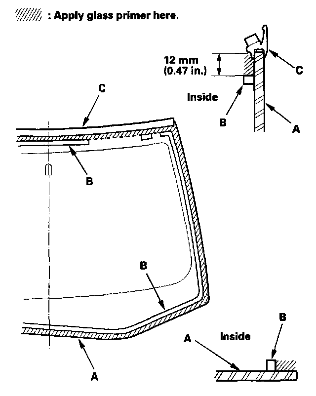 16. With a sponge, apply a light coat of glass primer around the edge of the windshield (A) between the dams (B) and molding (C) as shown, then lightly wipe it off with gauze or cheesecloth: