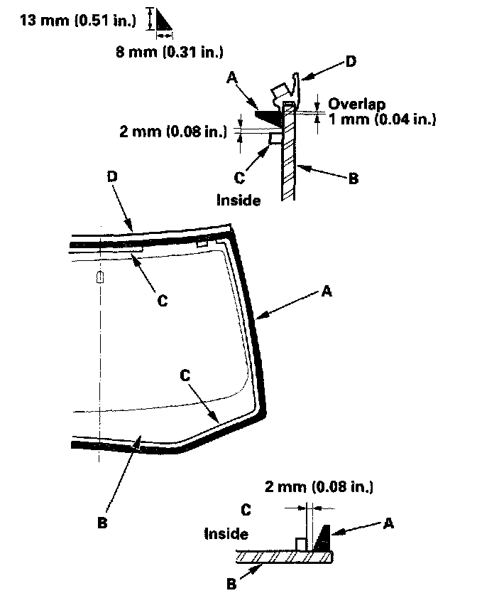 19. Pack adhesive into the cartridge without air pockets to ensure continuous delivery. Put the cartridge in a caulking gun, and run a bead of adhesive (A) around the edge of the windshield (B) between the dams (C) and molding (D) as shown. Apply the adhesive within 30 minutes after applying the glass primer. Make a slightly thicker bead at each corner.
