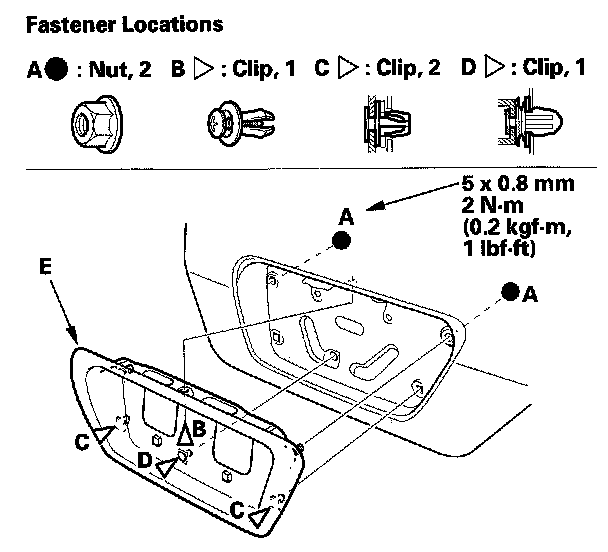 1. On the inside of the trunk lid, remove the nuts (A), and release the clips (B, C, D), then remove the rear license trim (E). Take care not to scratch the trunk lid.