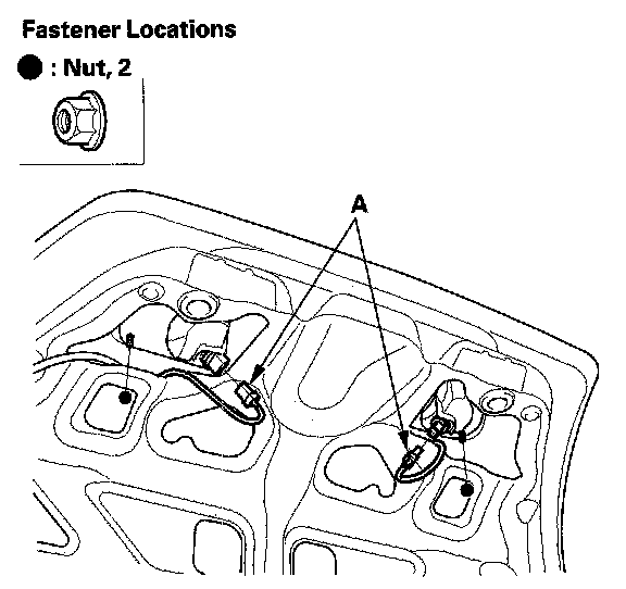 2. From inside the trunk lid, disconnect back-up connectors (A), then remove the nuts.