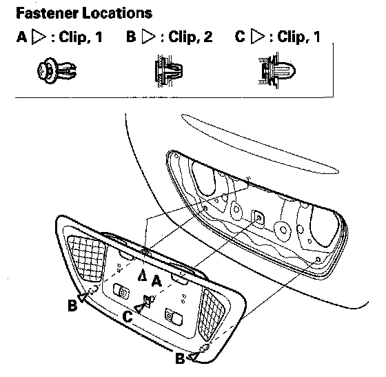 3. On the inside of the trunk lid, release the clips (A, B, C), then remove the rear license trim (D). Take care not to scratch the trunk lid.