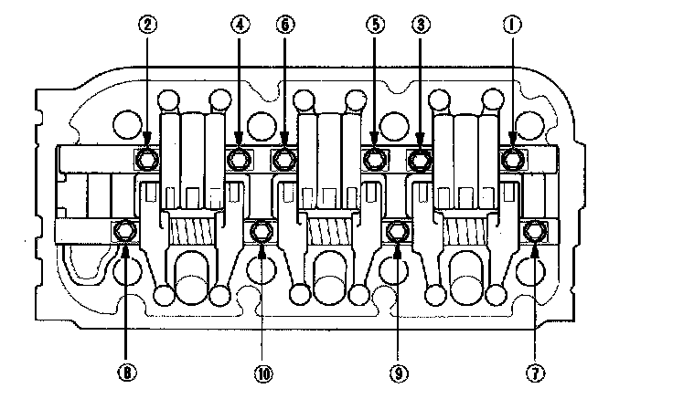 - 2 When removing the rocker arm assembly, do not remove the rocker shaft mounting bolts. The bolts will keep the springs and the rocker arms on the shafts.