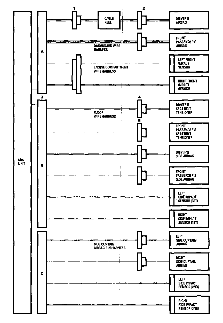 - Before disconnecting SRS unit connector B (3) from SRS unit, disconnect both seat belt tensioner 4P connectors (4,5).