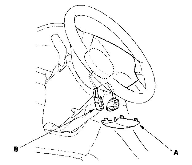 2. Remove the access panel (A) from the steering wheel, then disconnect the driver's airbag 4P connector (B) from the cable reel.