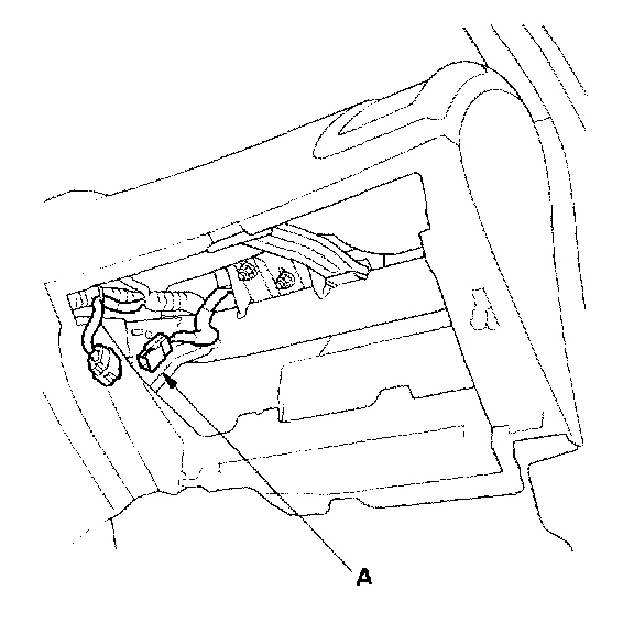 3. Remove the glove box, then disconnect the front passenger's airbag 4P connector (A) from the dashboard wire harness.