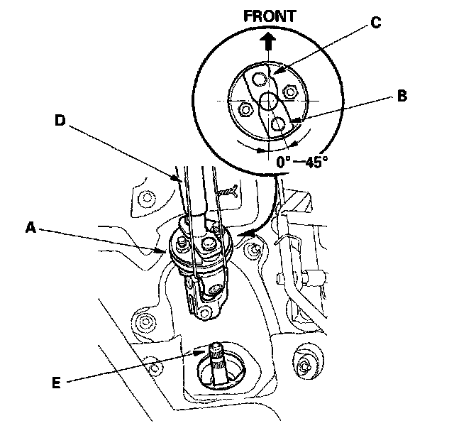 27. Align the bolt hole (A) on the steering joint with the groove (B) around the pinion shaft, and loosely install the joint bolt (C). Make sure that the joint bolt is securely in the groove of the pinion shaft. Pull on the steering joint to make sure that the steering joint is fully seated.